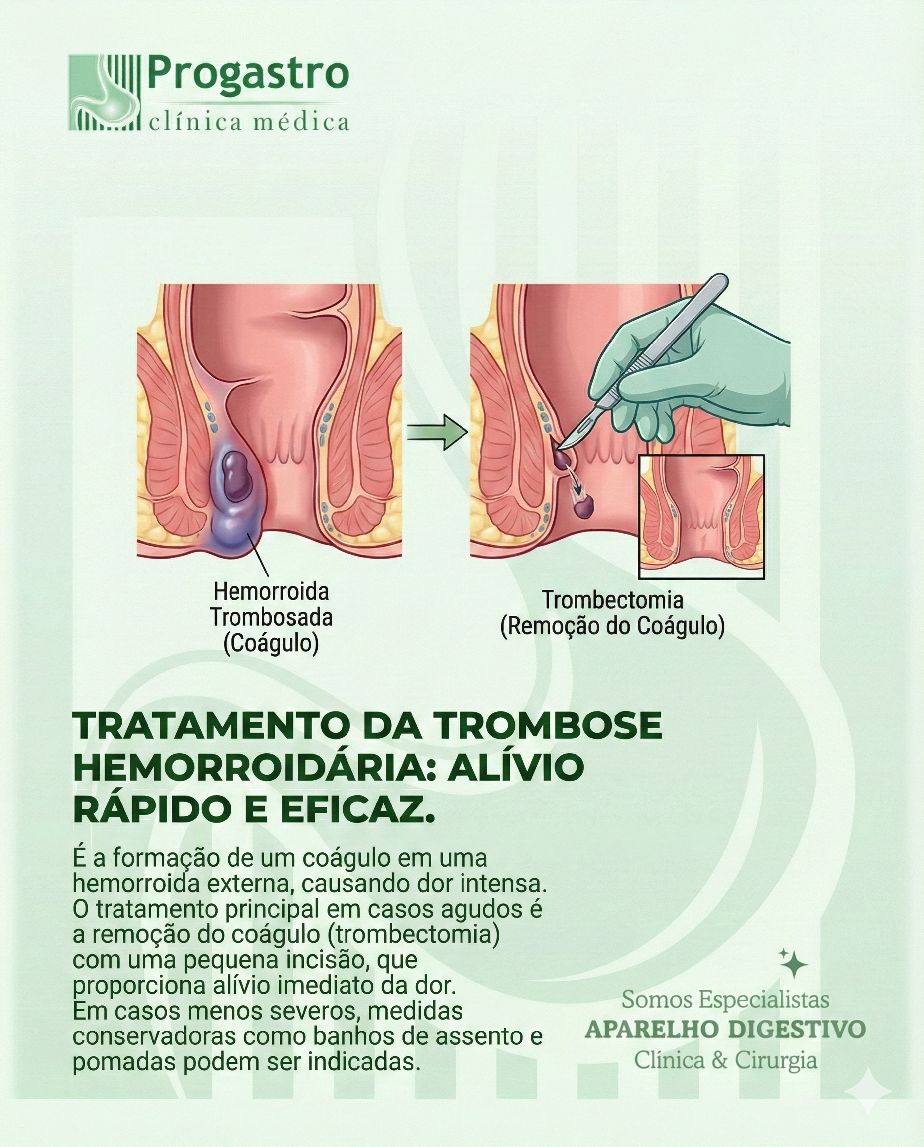 A trombose hemorroidária é uma complicação aguda que ocorre tanto nas hemorroidas externas como internas, caracterizada pela presença de isquemia e trombo nos coxins vasculares submucosos do canal anal. O aparecimento da trombose hemorroidária é abrupto. A dor associada é muito intensa, contínua e tipo latejante. Há secreção e sangramento perianal, com características arteriais. Pode haver dificuldade evacuatória e retenção urinária. O diagnóstico da trombose hemorroidária é Clínico, realizado através da inspeção anal.